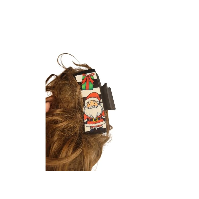 - The hair clip is designed in a Christmas Design featuring Santa and a Gift