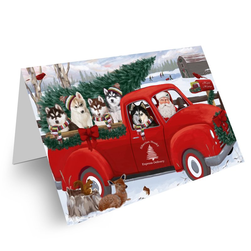 Christmas Santa Express Delivery Red Truck Siberian Huskies Dog Greeting Cards - Adorable Pets Invitation Cards with Envelopes - Pet Artwork Christmas Greeting Cards GCD69044 (1 Greeting Card)