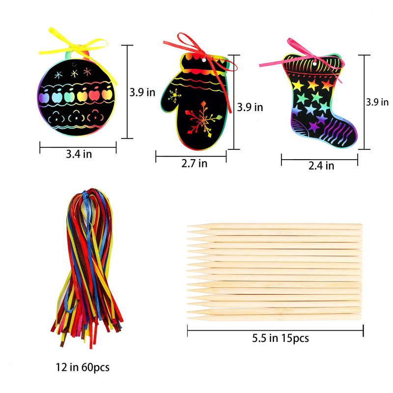 - Value Pack: 60 scratch papers (15 patterns), 60 colorful ribbon, 15 wooden drawing sticks. enough quantity and variety of styles to satisfy your Christmas decorating needs.