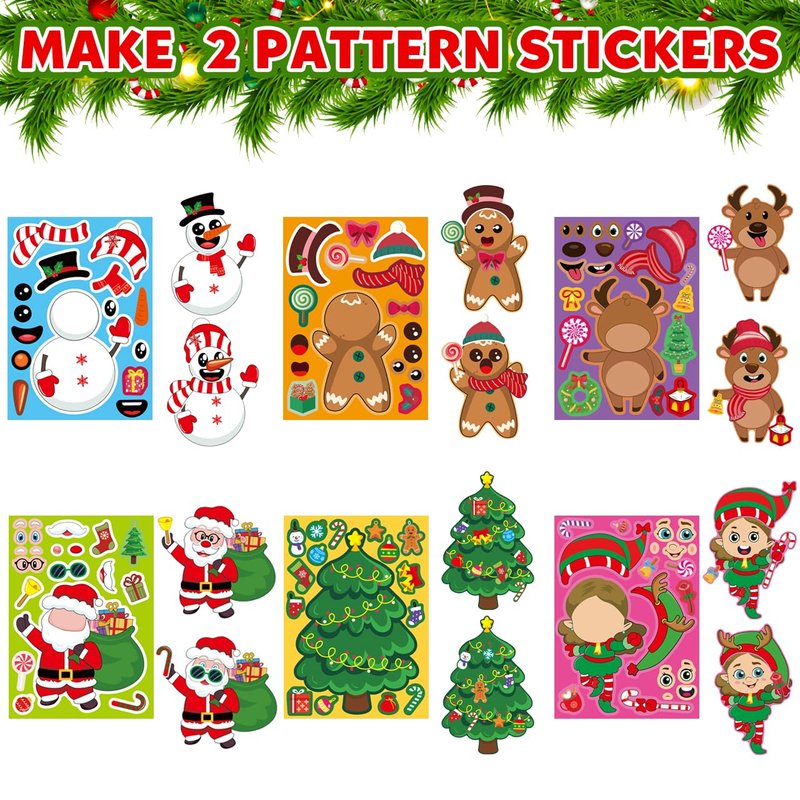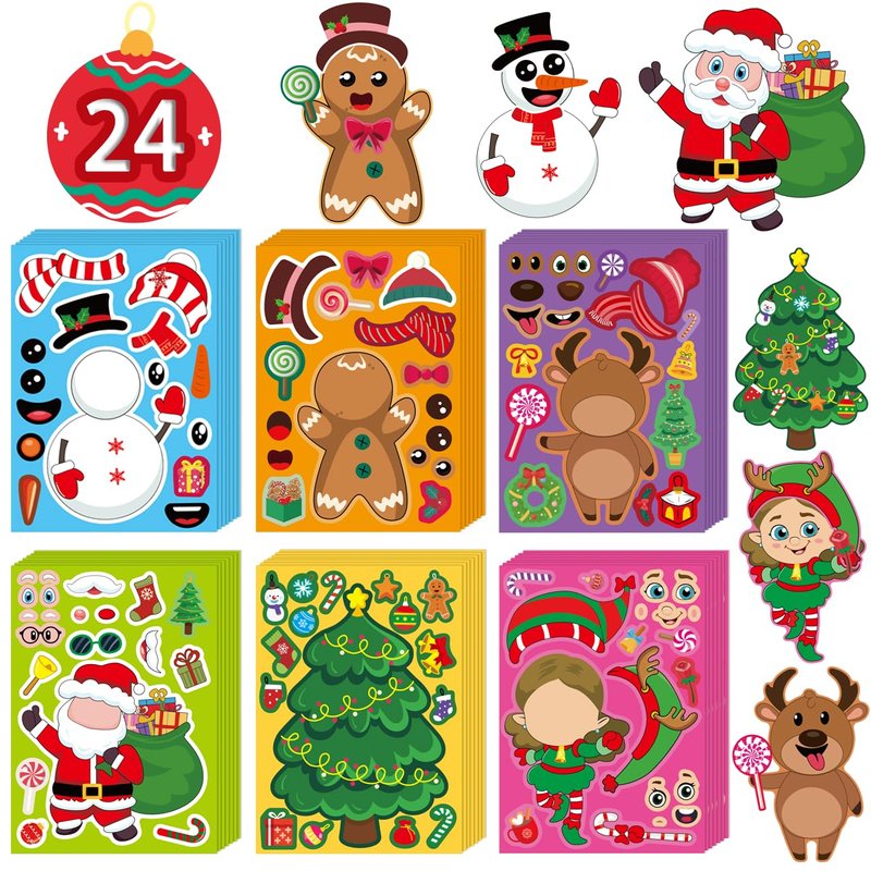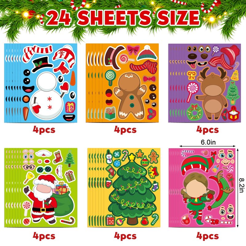 - DIY Christmas Stickers: Including 24 sheets Funny Christmas party favor stickers with 6 different Christmas faces to decorate, a snowmen, a Santa Claus, a reindeer and a girl. Each Christmas craft stickers( 5.11” X 7.5”) are combined by rich colorful variety of Christmas elements, like bell, Santa hat, gloves, candles, candy, gift box, gingerbread, cane, bow etc, diverse and attractive Christmas stickers will be a hit among children at Christmas.