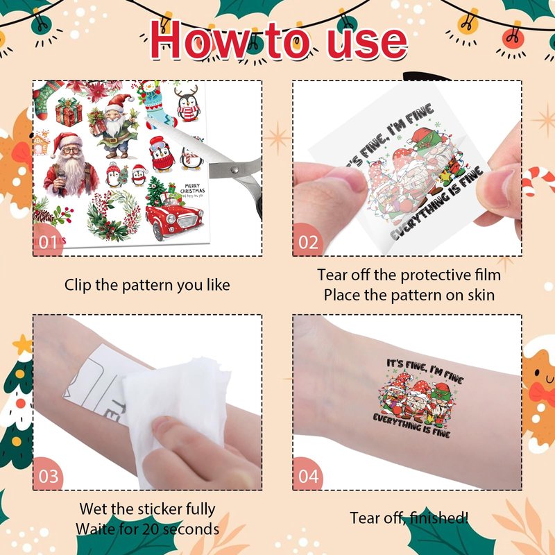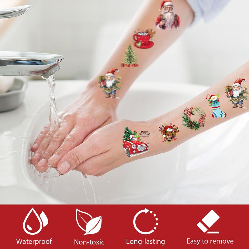 - Safe Waterproof Lasting: The Christmas temporary tattoo uses safe ink, which is healthy and lasting, and is waterproof. It can last for 3–5 days, depending on how long you bathe, scrub, and rub. It is suitable for tattooing on any part of the skin, such as arms, shoulders, calves, calves, face, back of hands, etc., to decorate yourself