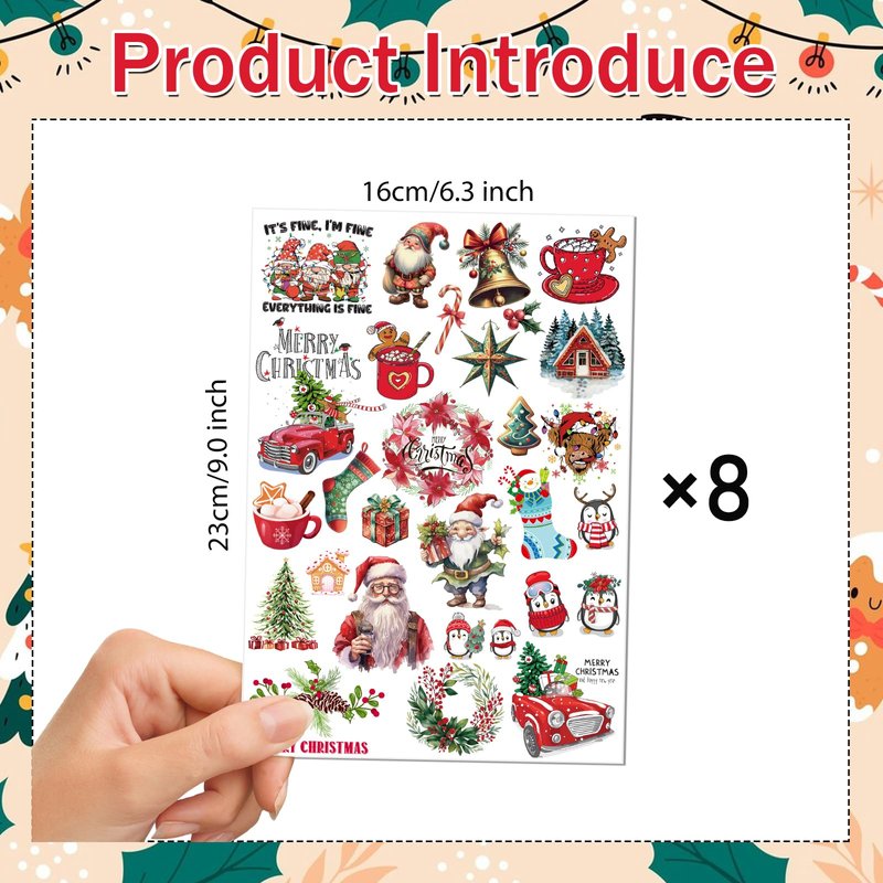 - Package Content: You will receive 8 sheets of Christmas tattoo stickers, with a total of 150+ pattern combinations, about 9.0×6.3 inches in size. The design makes funny Christmas fake tattos is waterproof. No one will refuse these colorful and Santa Claus tattoo stickers