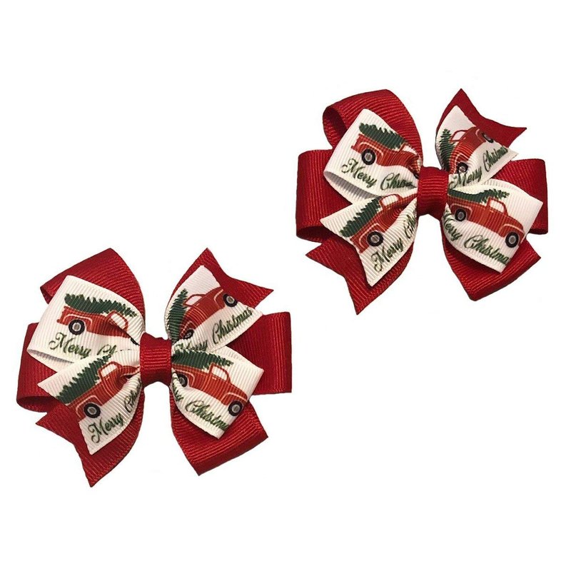 These bows come 2 in a set. They can be mounted on small french barrettes OR partially lined alligator clips. Each set consists of one bow for the right side of the head and one bow for the left side of the head. Each of these bows measure 3.5 inches wide by 3 inches high.