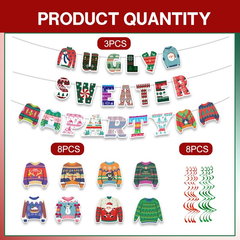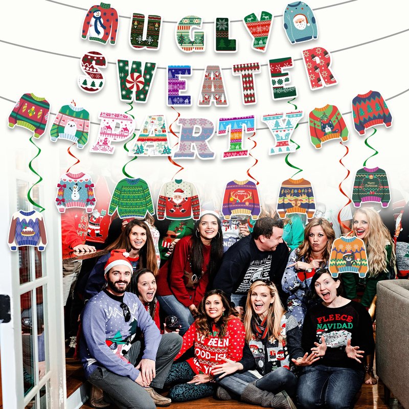 - Christmas Ugly Sweater: Looking for a colorful ugly sweater banner decoration? This Christmas banner has classic Christmas colors, and the traditional ugly sweater element banner is perfect for hosting an amazing and unforgettable ugly sweater party, Christmas celebration, it's about to be ugly
