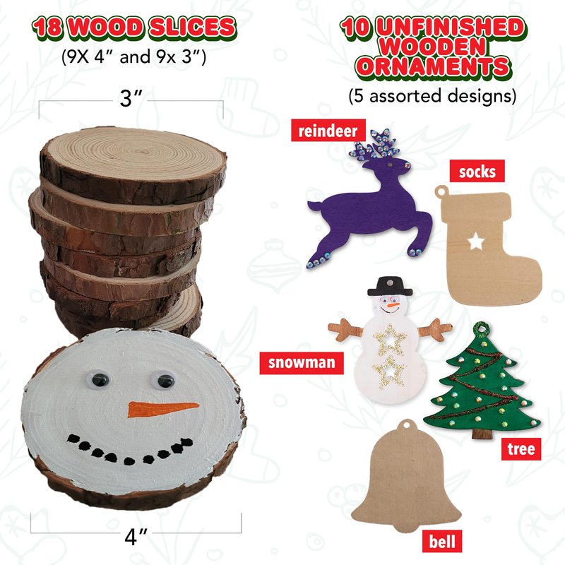 Christmas Wooden Ornament Craft - Includes 28 Ornaments - Wooden Painting Craft Kit for Kids & Adults with Wood Slices, Xmas Shapes, Glow in The Dark Paint, Gems, Glitter Glue, and Google Eyes