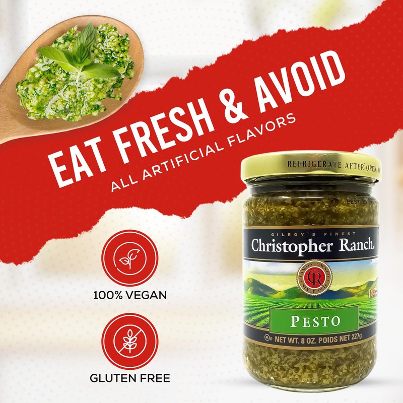 - Authentic Gilroy Flavor: Christopher Ranch Gourmet Pesto Sauce, proudly family-owned since 1956, encapsulates the essence of the garlic capital of the world. Immerse your dishes in the rich heritage of Gilroy's finest, USA-produced pesto.