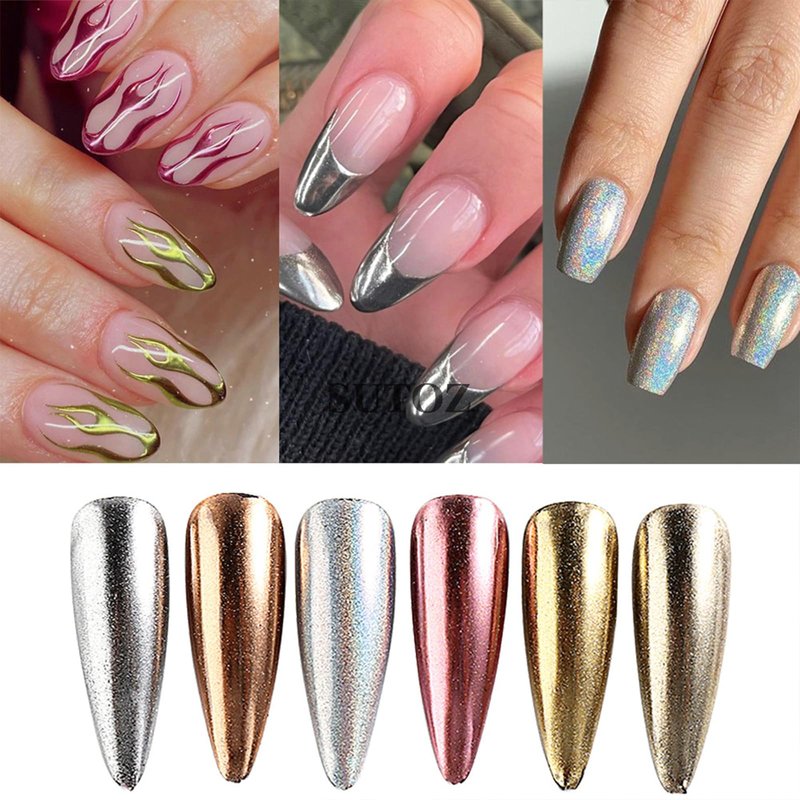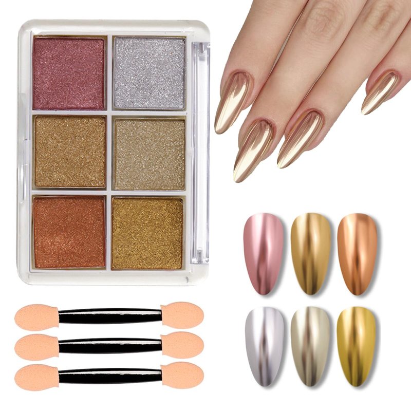 - What You Will Receive: 1 box 6 grids nail powder pigment and 3 sponge stick. The solid chrome nail powder has a high gloss, mirror effect, and metallic effect.Each color can reflect a different color, there are different amazing chrome effects, and the charm is infinite.