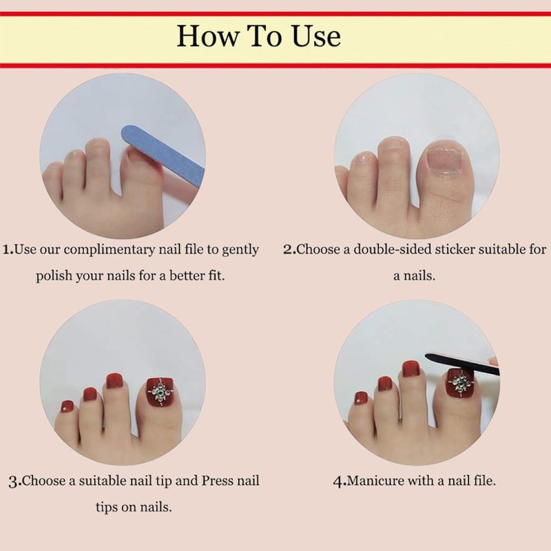 4. Trim according to the shape and length of the press on toenail you want.Tips: Try to keep away from water from 1-2 hours, artificial nails will be last longer time.