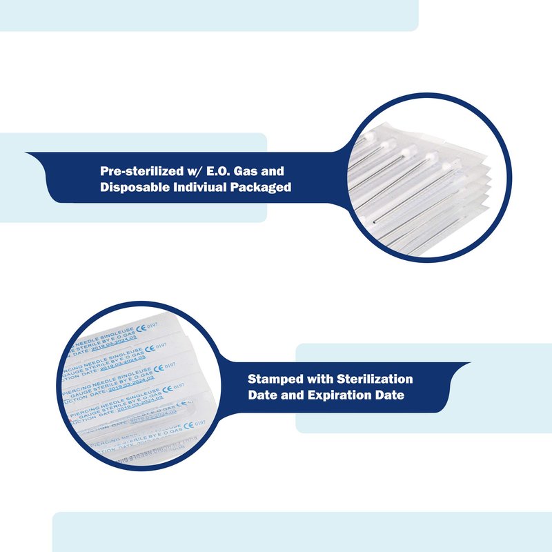- Each needle was individual sealed and has been pre-sterilized w/ E.O. Gas (ethylene oxide). Sterilization Date and Sterilization Expiration Date are clearly stamped on the back of package. Sterile rubber piece on needle tip for protective purpose.