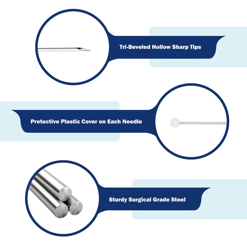 - Needles are hollow, tri-bevelled and laser sharp for reducing damage during application onto client.