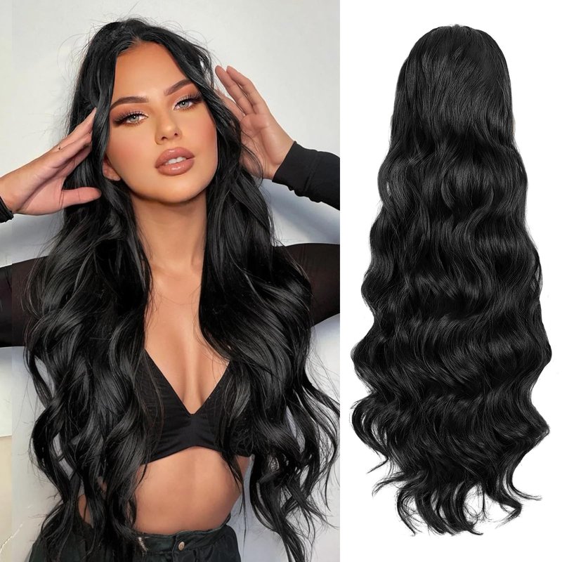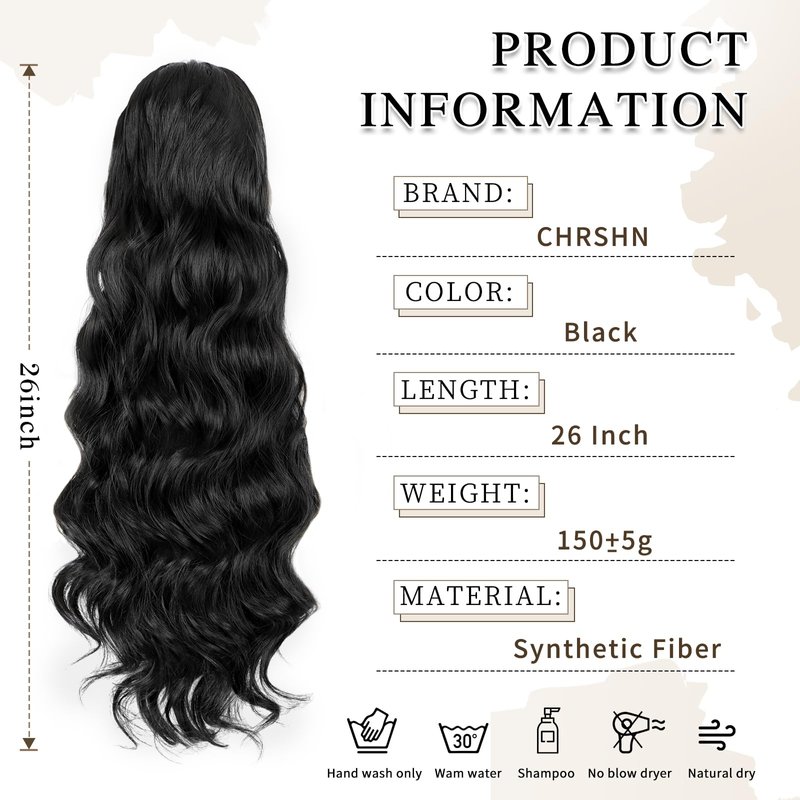 CHRSHN Ponytail Extension, Black Drawstring Ponytail Extension for Women 26 Inch Long Wavy Ponytail Extension Synthetic Clip in Pony Tails Hair Extensions for Women Girls