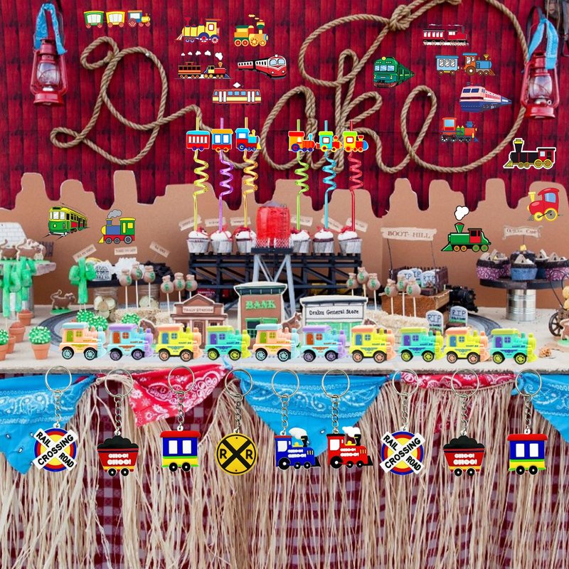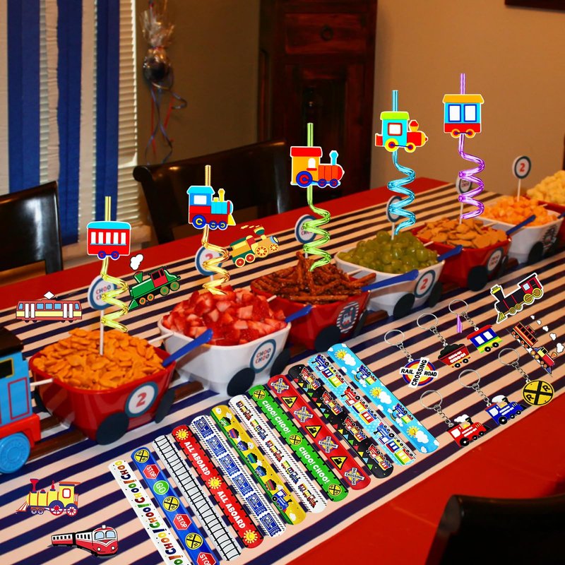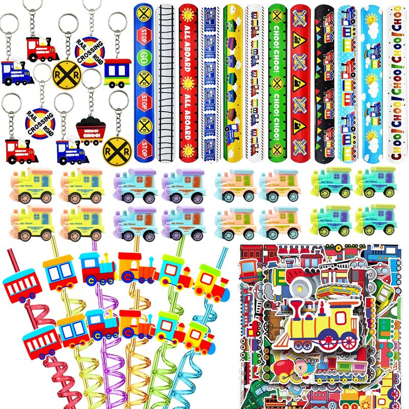 - Train Party Favors: you will receive 122 pieces of train birthday party supplies, including 12PCS train pull-back vehicles, 12PCS train slap bracelets, 12 PCS drinking straws 12PCS train themed straw accessories, 12PCS keychains and 50 DIY train themed stickers, enough for your daily use and gift wrapping needs, enjoying the nice train party with friends