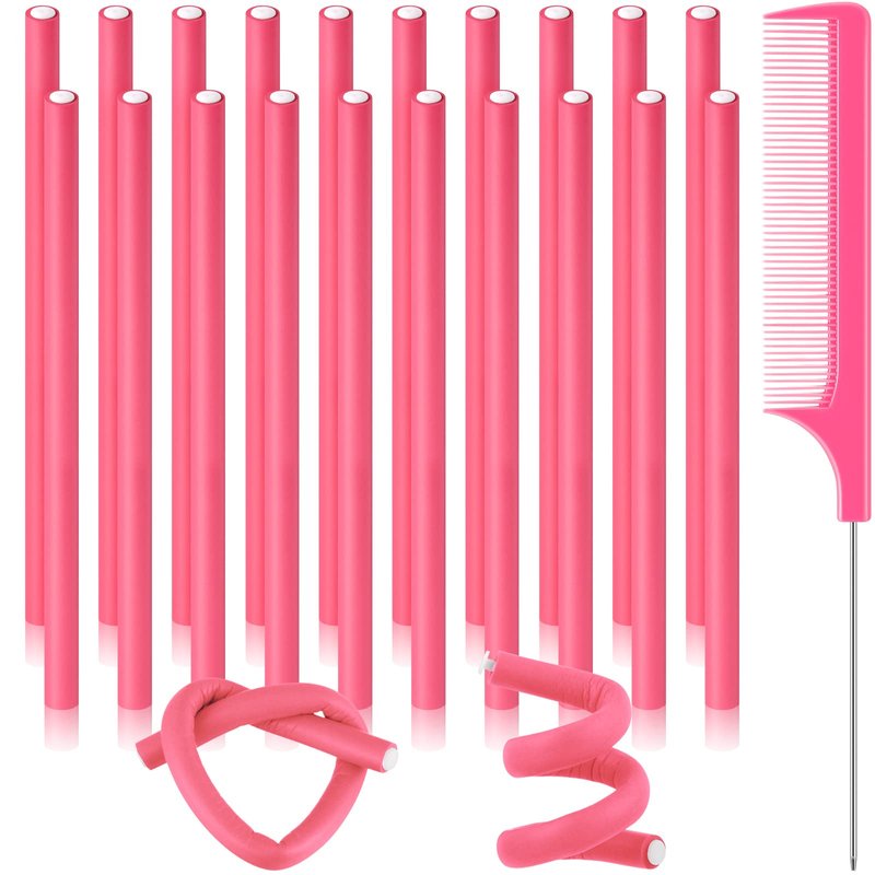 Chuangdi 20 Pcs Flexible Curling Rods, Soft Foam No Heat Hair Rollers Curlers and Steel Pintail Rat Tail Comb, for Women Girls Long and Short Hair (Dark Pink, 0.31 x 9.4 Inch)