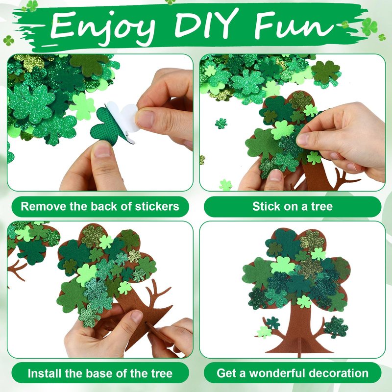 - Irish Charms: the traditional Irish clover and the sacred tree are 2 iconic symbols of St. Patrick's Day; Our package includes up to 424 felt stickers, 24 felt trees and 400 shamrock stickers; The clover sticker is available in three different sizes: approximately 1.6 inches, 1 inch, 0.6 inch in length while the tree sticker comes in an approximate size of 5.71 x 4.72 inches/ 14.5 x 12 cm; These stickers are good to set the Irish theming even more potently