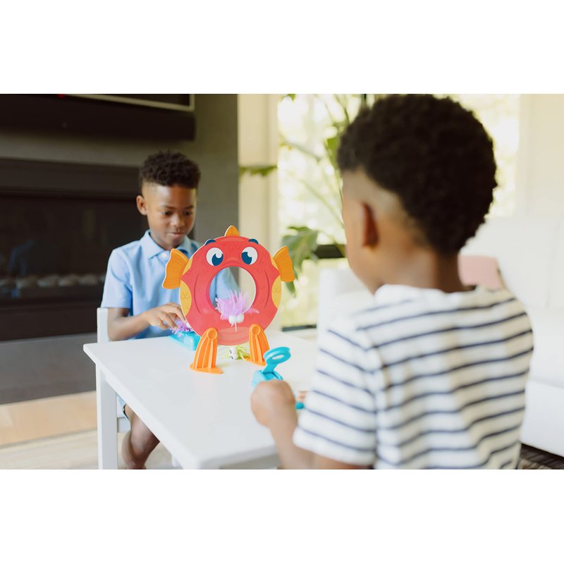 - Includes: 1 Big Hungry Fish with Stands, 6 Squishy Fish Food, 2 Fish Food Launchers & Instructions