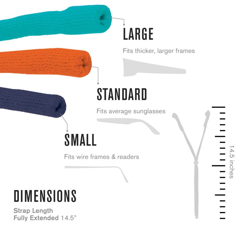 - ✔ Adjustable Fit, Standard Size – Chums Original Cotton Retainers feature a moveable bead that provides both a flexible fit and wear accommodation. By using a fitted bead and a 14.5” loop, you can either tighten or loosen your Chums to wear it around your neck or snug on the face. Unlike other brands, this strap secures your glasses and adjusts to your desired fit. Chums Original Cotton Retainers come in 3 frame sizes: Standard, Large and Small. Please refer to our guide photo for sizing