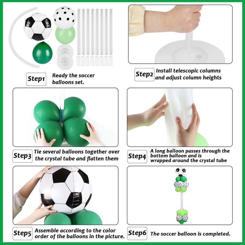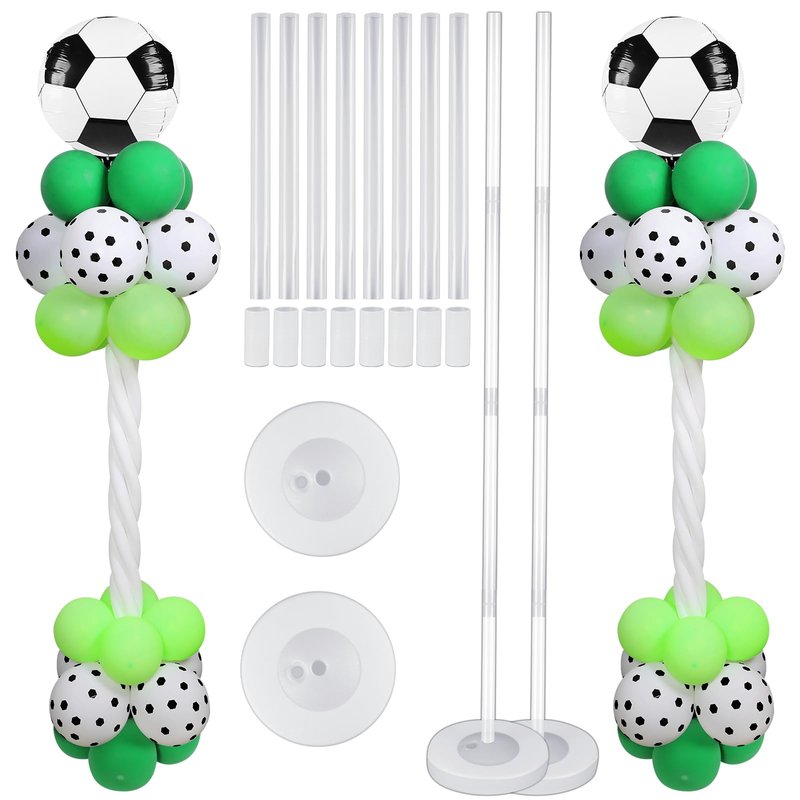 - Package includes: You will get 2pcs 22 inches 4D footballs, 16pcs 12 inches soccer balloons, 16pcs 10 inches dark green balloons, 16pcs 10 inches light green balloons, 10pcs long white balloons. The soccer balloon column stand kit also comes with 8 crystal tubes, 8 connectors and 2 bases.