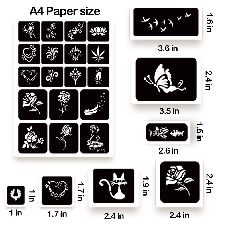 - 【 What's included 】- 20 pages of unique and strong adhesive A4 size tattoo stencils for women, girls, boys, kids, teens, and adults. (no pigment included). Exquisite packaging, almost unlimited creative combinations and options to meet your every need. Recommended for boys and girls ages 6 and up.