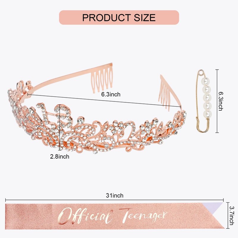 - One Size Fit All - Birthday sash - Length: 61” (155cm), Width: 3.7” (9.5cm); Rhinestone Tiara are adjustable as well comes with comb design that can holds and stable and comfortable on top of the hair. Birthday sash can be fixed and adjusted in length with pearl pins .
