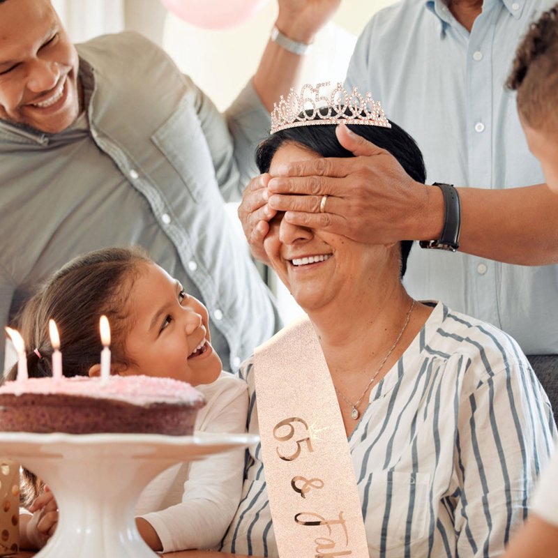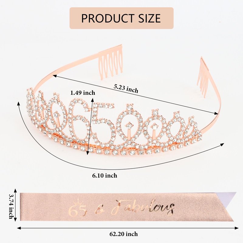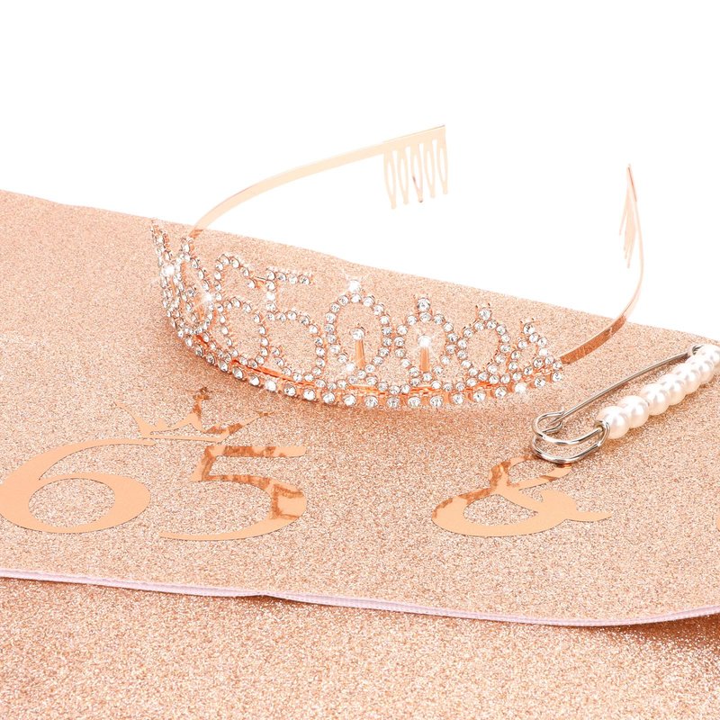 - The Perfect 65th Birthday Decorations for Women: "65 & Fabulous" birthday sash + rhinestone 65 tiara rose gold.