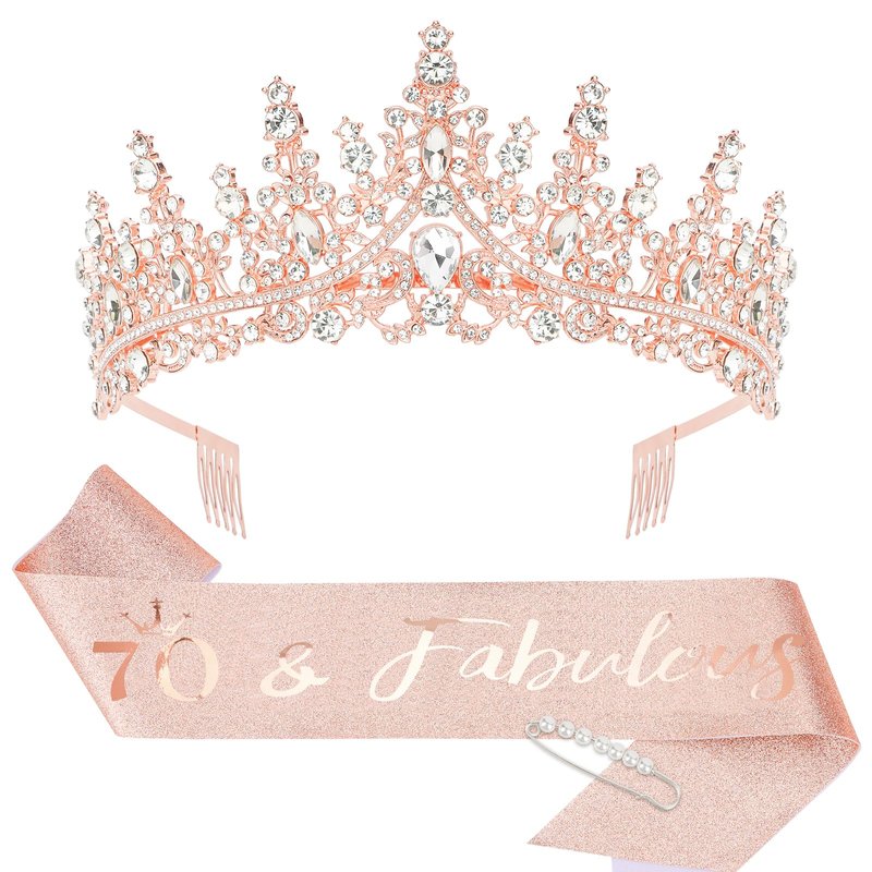 - The Perfect 70th Birthday Decorations: "70&Fabulous" birthday sash + rhinestone tiara rose gold.