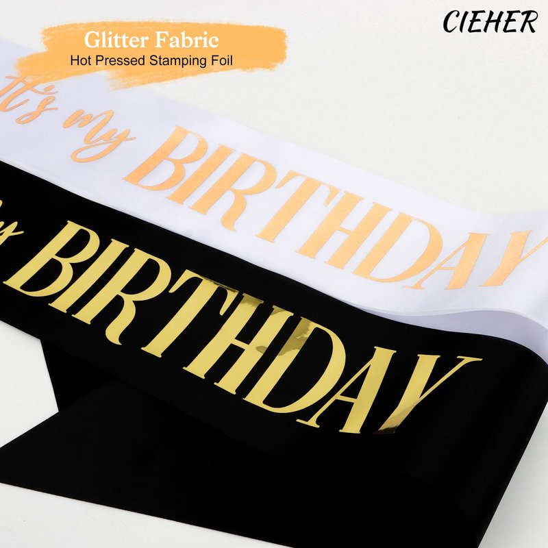 CIEHER (71.65" L x 3.6" W 2 Pack Birthday Sash for Women Girls, It's My Birthday Sash with Silver Glitter Fabric, Birthday Sashes, Birthday Decorations - White + Black Sash