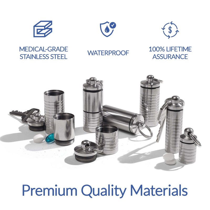 - Made of Superior Solid Materials - You deserve a pill container keychain that’s as tough and resilient as you are. Our mini pill holders are crafted with stainless steel. Engineered to outlast repeated use and the harshest conditions, they won’t break easily.