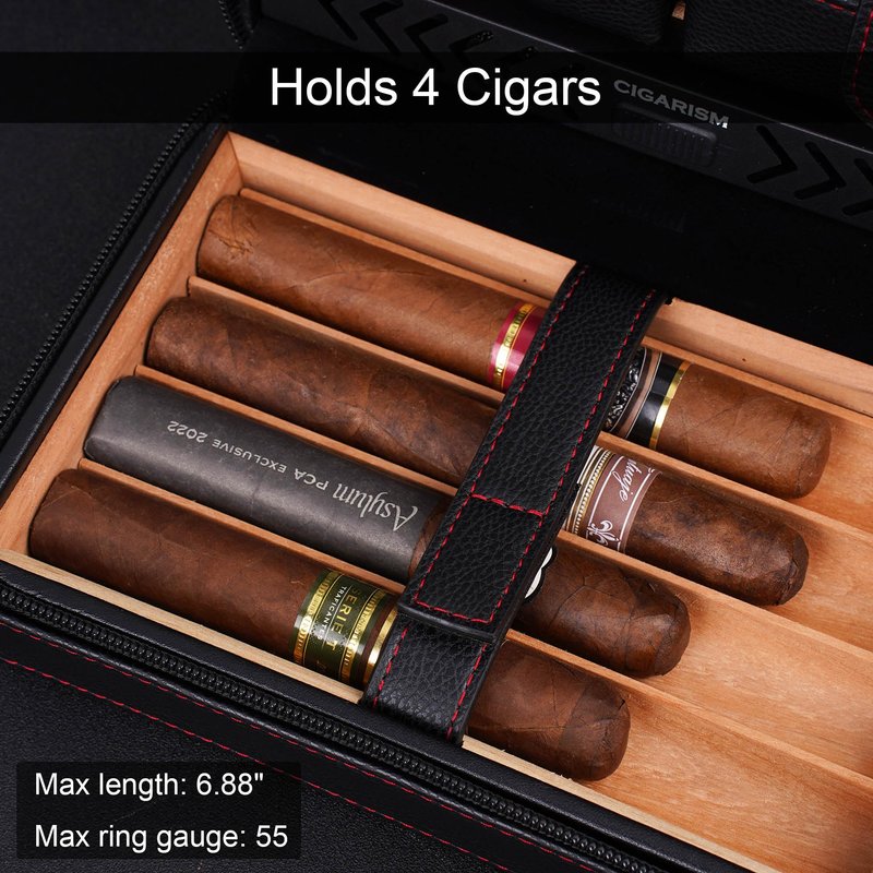 - 【LARGE CAPACITY】Dimension: 8.26"×5.11"×3.14"; Holds 4 cigars of max length 6.88" max ring gauge 55(22mm). With a strip to keep different size of cigars safe and sound while traveling.