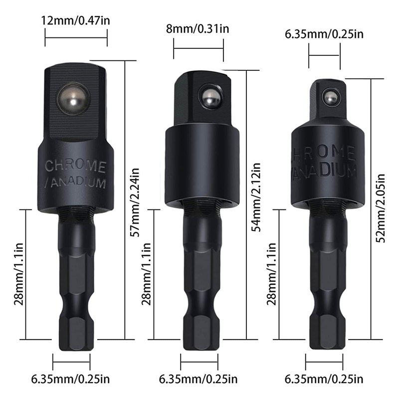 - Multifunction: 3-piece power drill sockets adapter sets, 360° rotatable hex shank impact driver socket adapter used in the installation of pneumatic screwdriver, electric screwdriver, pneumatic drill, manual screwdriver and other installation for the hexagonal tool. It is a good accessory for conversion. For universal socket, impact adapter and reducer set, universal joint set, socket adapter and drive reducer set, drive impact socket extension bar set, drive impact socket set