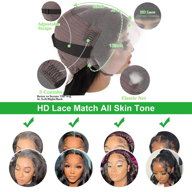 - HD Transparent Lace Front Wigs: 13x6 Hd Transparent Lace,Soft and Easy to Melt All Skins, Lightly Bleached Knots, Pre Plucked with Baby Hair Around,Allows More Air Into The Scalp, Breathe More;Longer Hairline, Natural Hairline, More Realistic, Any Parts You Like.
