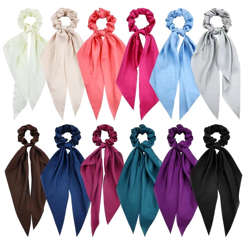 Cinaci 12 Pieces Solid Silky Satin Chiffon Hair Ties with Long Ribbon Bow Tail Hair Scrunchies Ponytail Holders Rubber Bands Accessories for Women Girls Teens