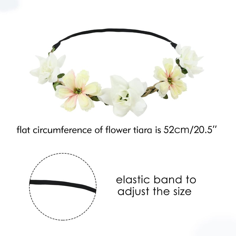 - 【ONE SIZE】--You can see the size of the flower wreath in the photo on the left, original circumference: approx 52cm/20", but they can fit for most women and girls because there is elastic band on the back to adjust the size. So there is no need to worry about size problem.