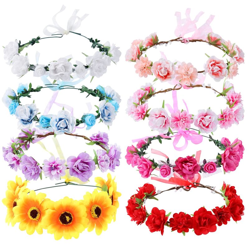 Cinaci 8 Pack Handmade Adjustable Sunflower Rose Flower Wreath Headbands Crown Garland Wedding Party Headpiece for Women Brides Bridemaids Girls Teens