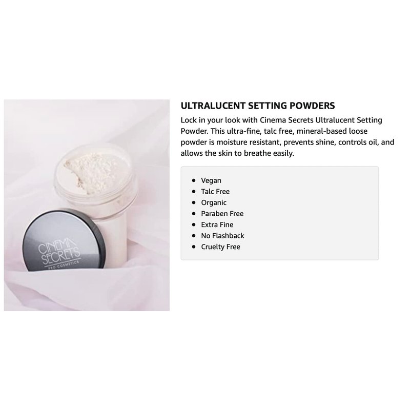 Lock in your look with Cinema Secrets Ultralucent Setting Powder. This ultra-fine, mineral based loose powder is vegan, Talc-free, moisture resistant, prevents shine, controls oil, and allows skin to breathe easily.