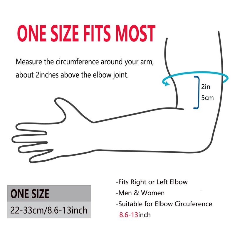 - One Size Fits Most: Fits both right and left arm, for men and women,The elbow brace is ergonomically designed to fit the curve of the elbow, Suitable elbow circumference 22-33cm/8.6-13inch.