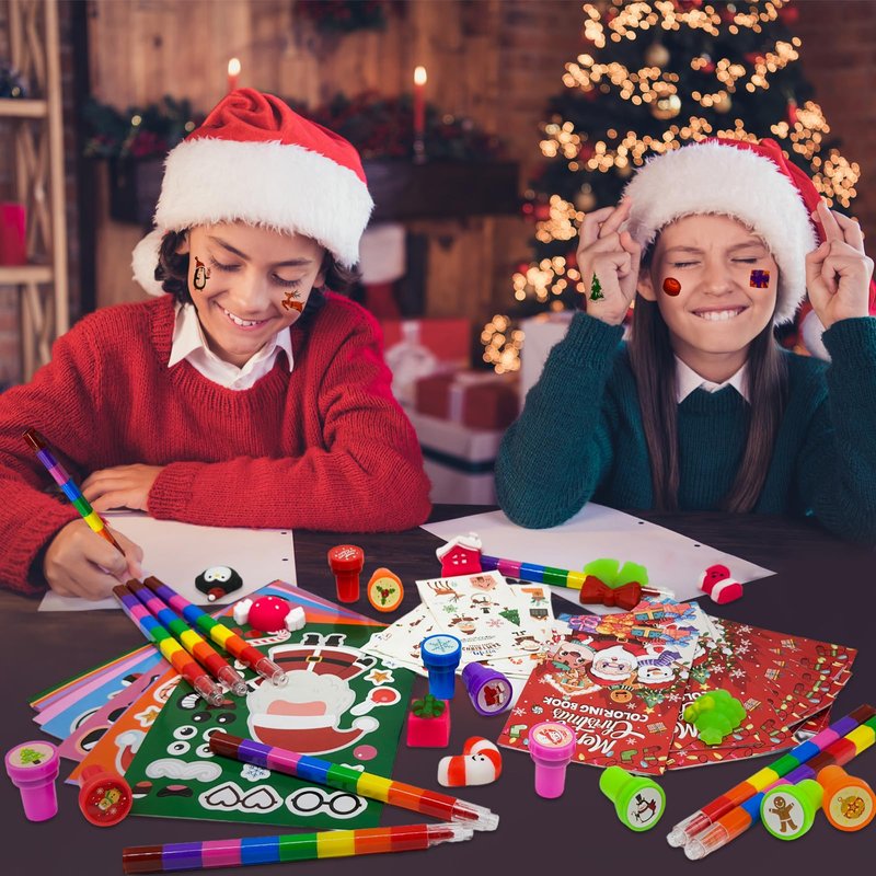 - Christmas Party Favors Set: our Christmas school DIY set includes 24 coloring books(12 pages per book), 24 rainbow stacking crayons(8 colors),24 tattoos, 24 stampers, 24 DIY Art Craft stickers, 24 Christmas pattern squishy pinch gift, sufficient quantity, and various styles enrich your school Christmas party