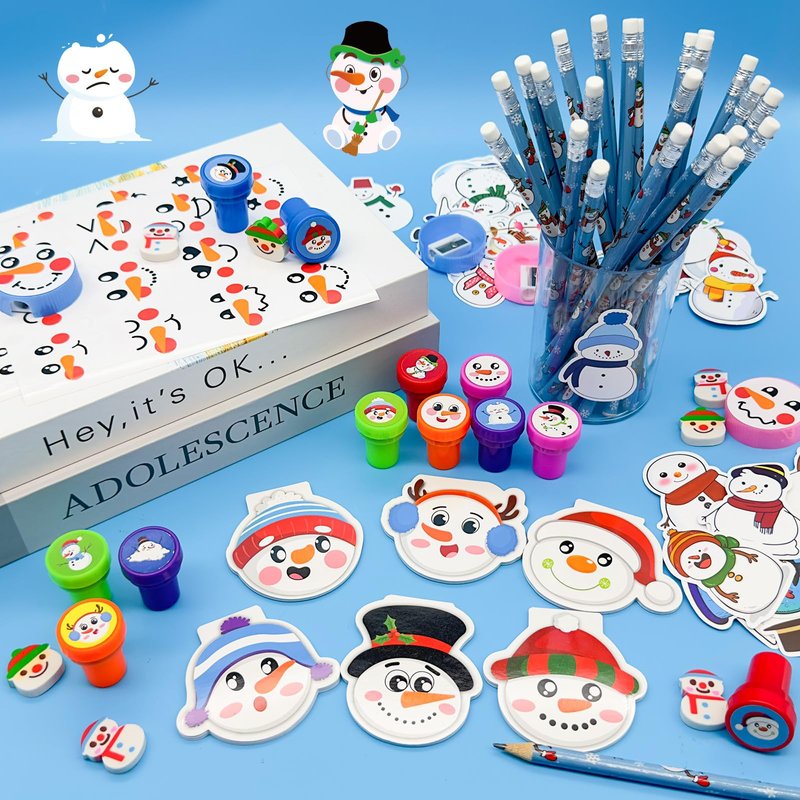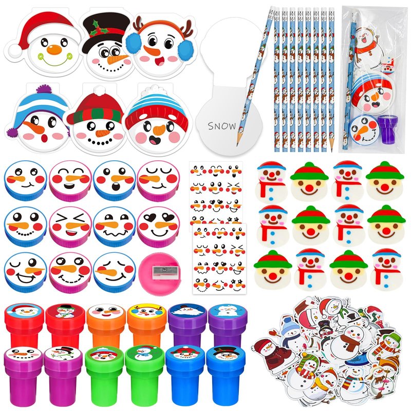 Cinrobiye 194 Pcs Christmas School Stationery Set Xmas Classrooms Exchange Stationery Party Favors Class Reward Prizes Notebooks Pencils Sharpener Erasers Stickers Stamps for Party Supplies (Snowman)