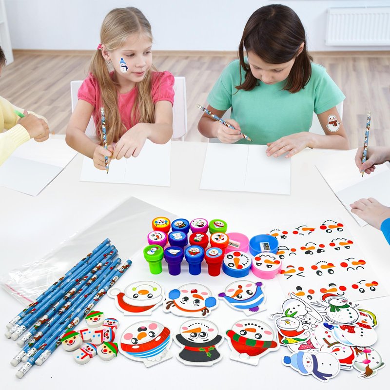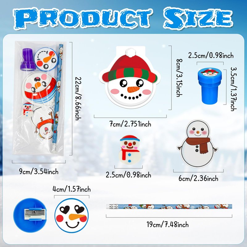 - Various Stationery Sets: our Christmas school stationery set includes 24 round stickers, 24 pencils, 24 erasers, 24 stamps, 24 Xmas tree pencil sharpeners, 24 opp bags,50 snowflake stickers to meet your needs