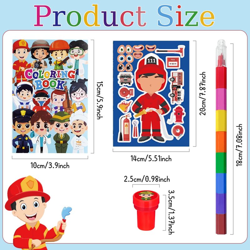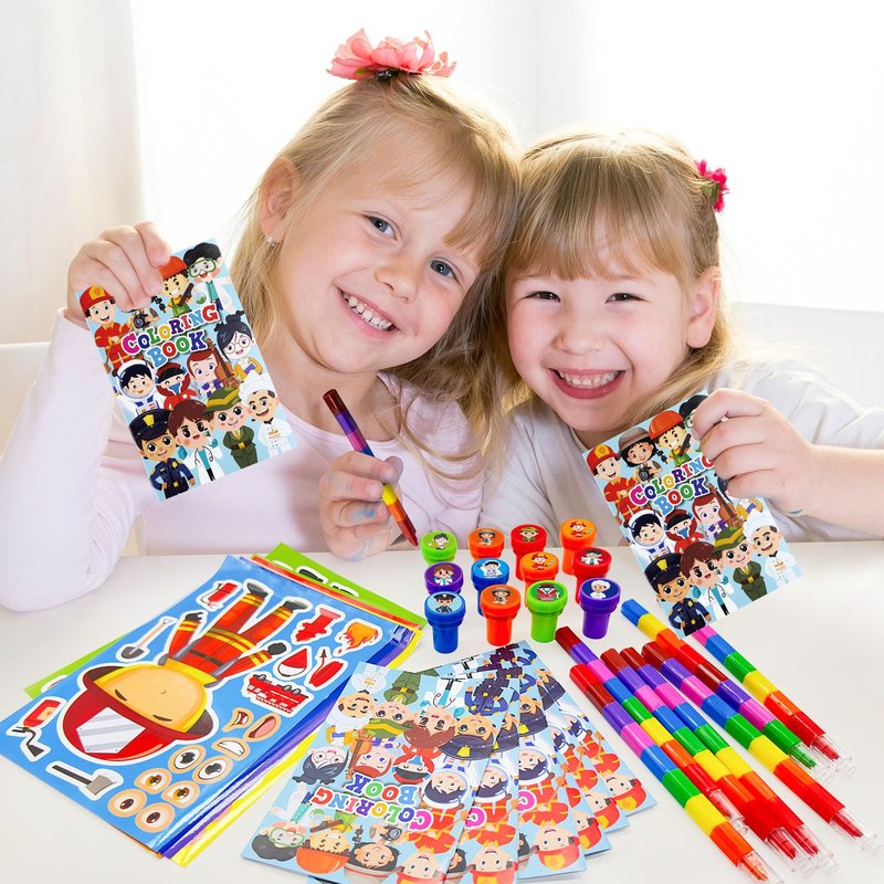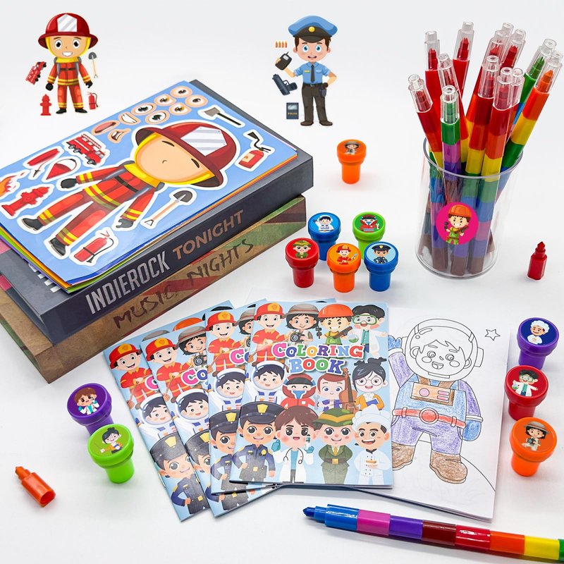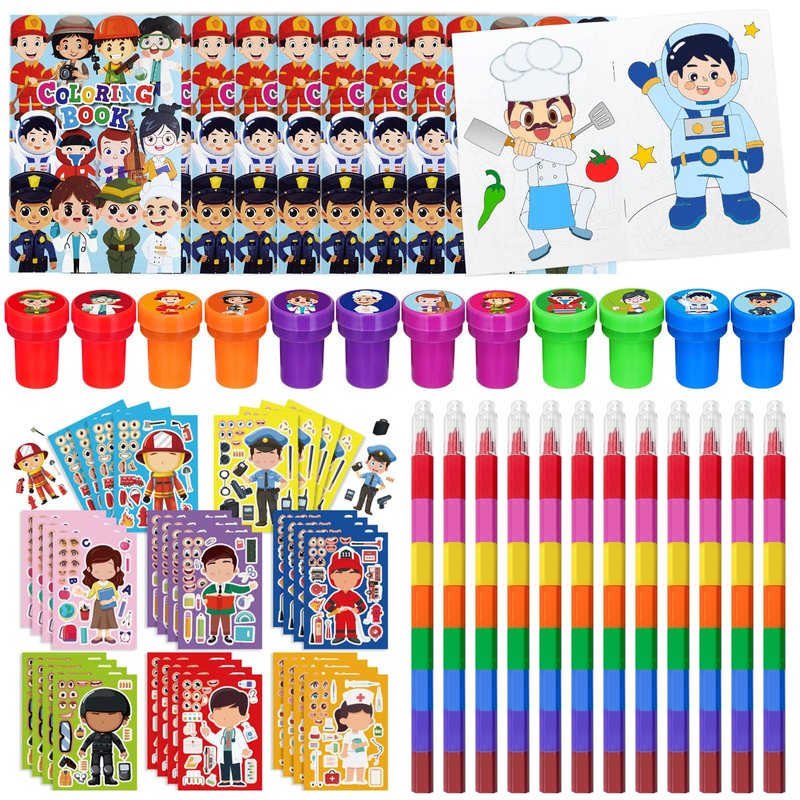 - Occupation Party Favors Set: our occupation party favors bulk includes 12 coloring books(12 pages per book), 12 colorful pens(8 colors), 12 stampers, 12 DIY craft face stickers,sufficient quantity, and various styles enrich your school birthday party