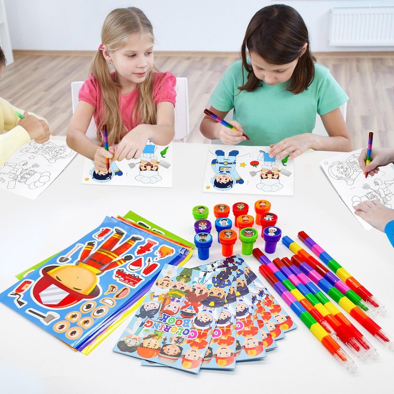 - Size Information:school birthday party supplies coloring books is about 4X6 inches,8 different colors stacking crayons is about 7 inches,stampers are about 1 x 1.38 inches,DIY sticker is about 4 inch