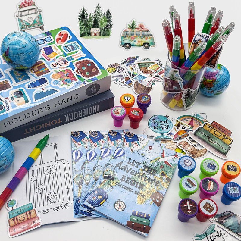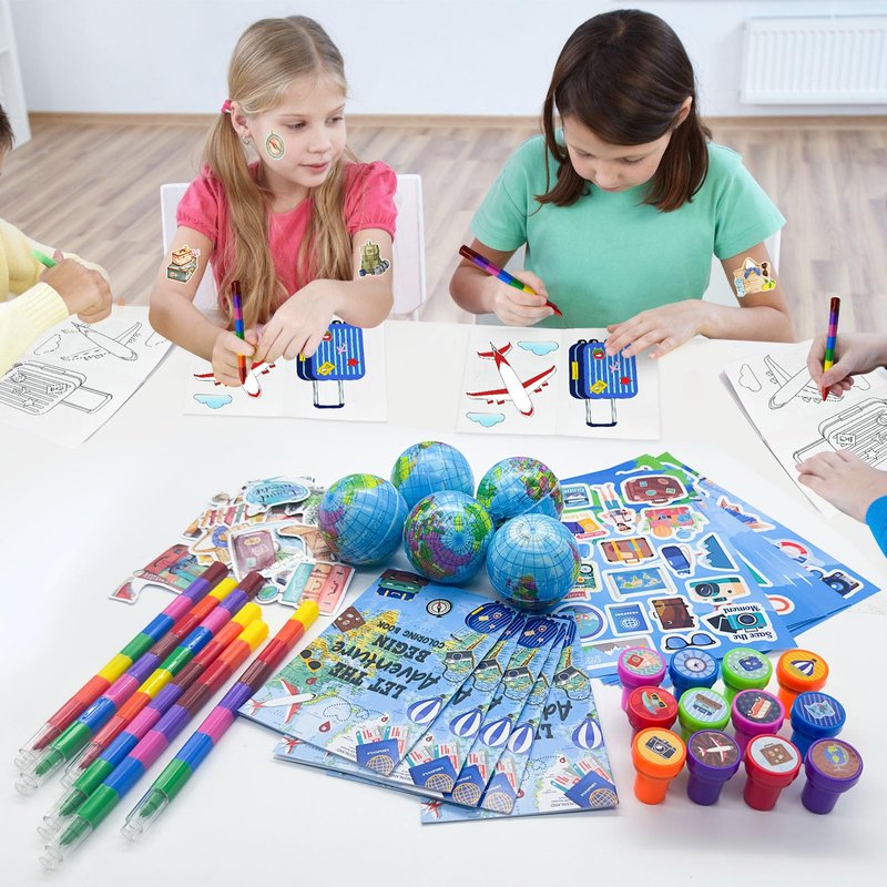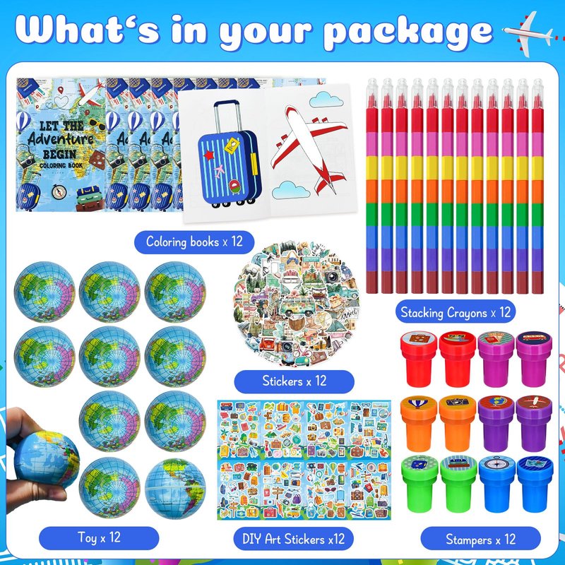 - Adventure Party Favors Set: our adventure coloring book bulk includes 12 coloring books(12 pages per book), 12 rainbow pencils(8 colors), 12 stampers, 12 DIY Craft stickers,12 world ball,12 PVC stickers,sufficient quantity, and various styles enrich your travel birthday party