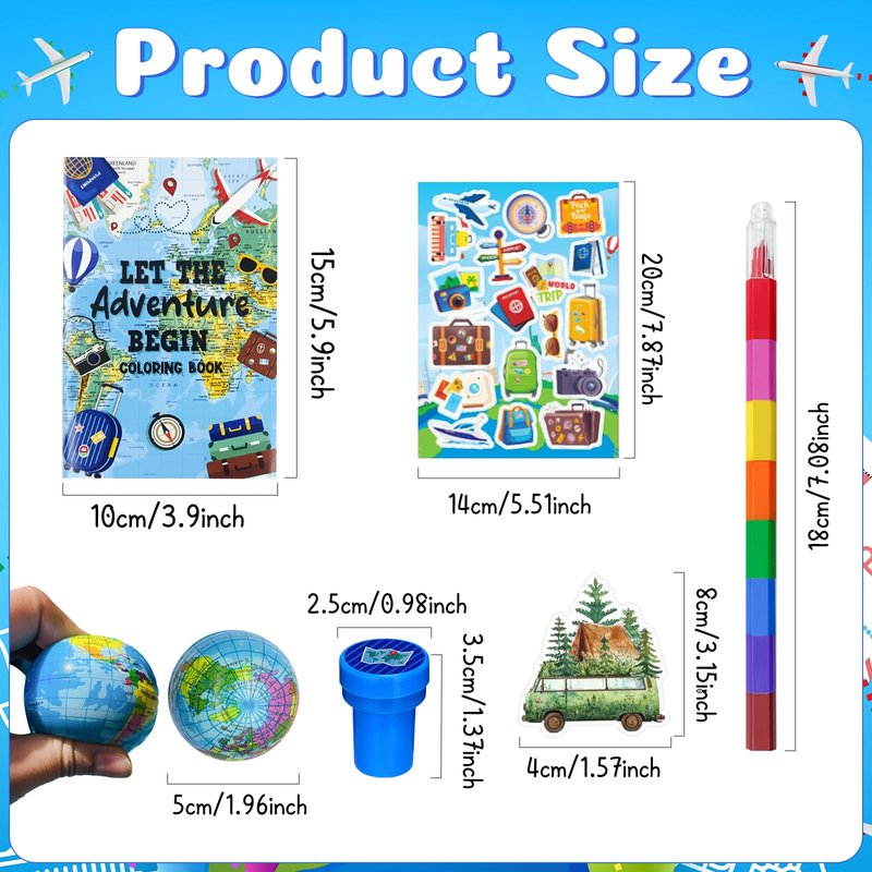 - Size Information:Bon Voyage party supplies coloring book are about 4X6 inches,tattoo stickers are about 2.68 x 4.72 inches, and 8 different colors stacking pencil is about 7 inches,stampers are about 1 x 1.38 inches, sticker is about 2 inches, world ball is 2.5 inches