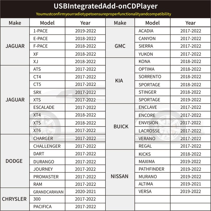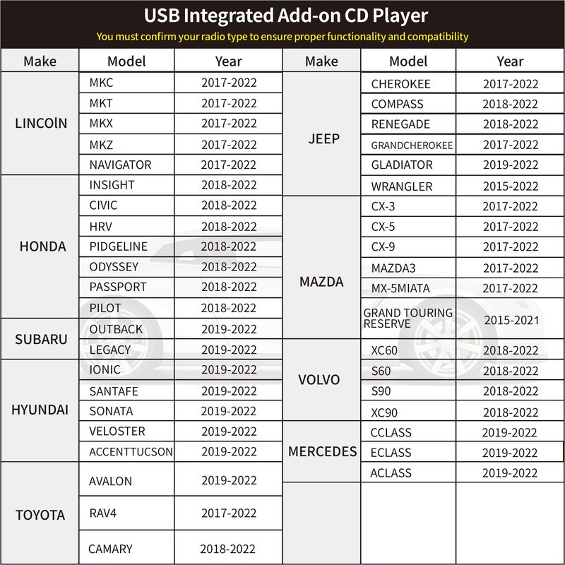 - ⚠️Note: Before purchasing the CD player,Please review the vehicle fit guide in site page images for USBCDPLAY for model and year compatibility.The unit can be mounted either Vertical or Horizontal; Do not install upside down or past the zero degrees vertical angle.