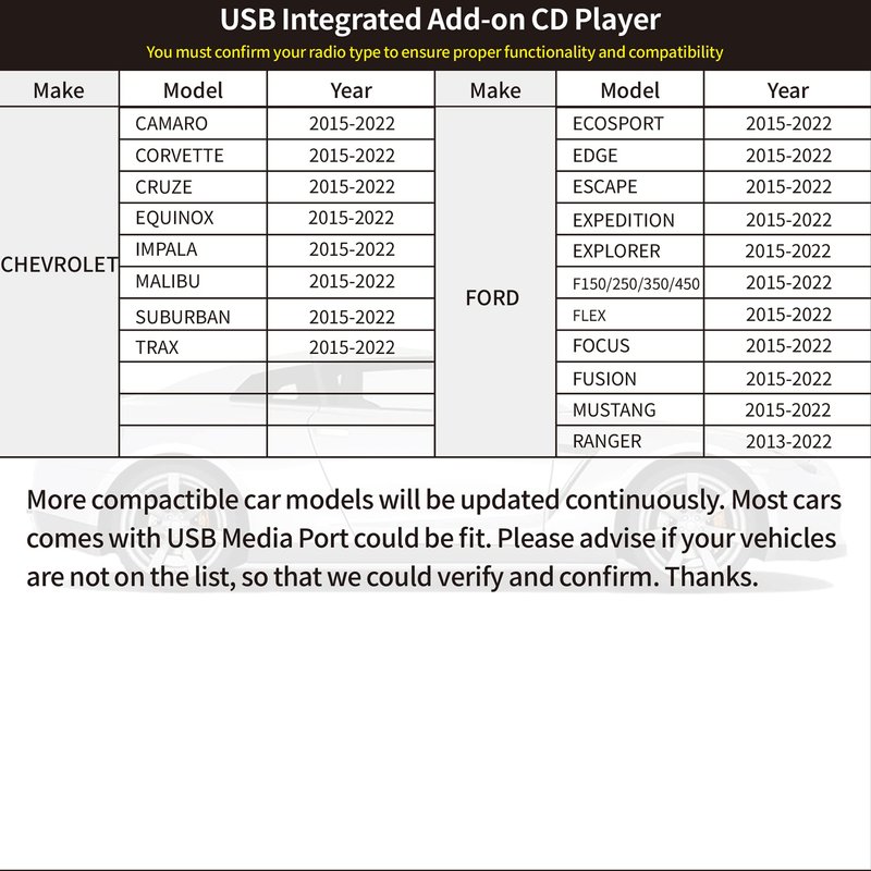 - 【Included Components】The product include one CD Player and USB Cable. Plug and play,powered by USB port, no extral adapter needed. Note: Factory car radio needs to support USB flash drive functionality and have a player that can play all file formats on the DISC.
