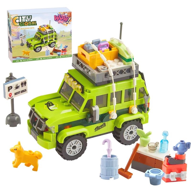 - 【Rich Accessories】Suitable for children aged 6 and above, this toy set includes a city camping car assembly kit with accessories such as a water bucket, camping stove, fire extinguisher, handbag, tea cup, glass bottle, umbrella, bread, and road signs, along with a big yellow dog