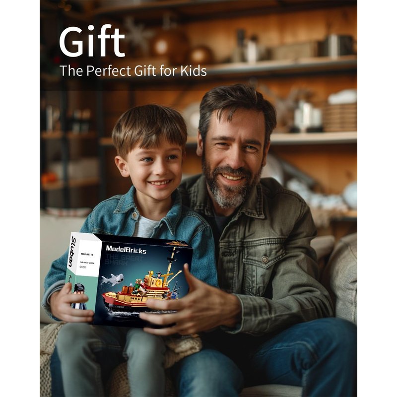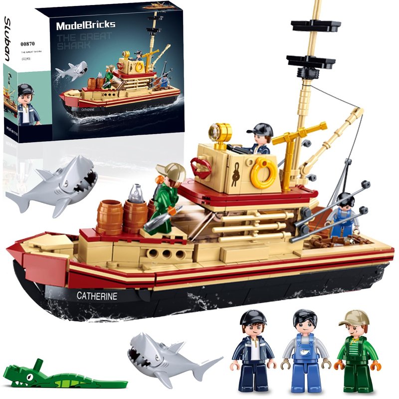 - Realistic Maritime Elegance: Crafted with precision, the jaws toys boat model embodies the spirit of a seafaring vessel. The sturdy hull, intricate deck, fishing gear, and lifebuoys all replicate the authentic look and feel of a real fishing boat. With 592 pieces, this set lets you recreate unforgettable scenes from the timeless movie.