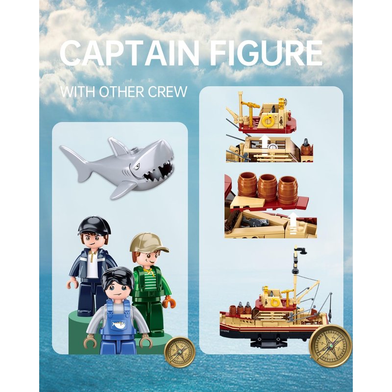 - City JAWS Building Block: The "Catherine" boat model is a mesmerizing tribute to the iconic "Jaws" adventure, brought to life with meticulous details. From fishing rods and barrels to a realistic control room and a functional propeller, every component of this set immerses you in the exhilarating realm of deep-sea exploration. The included shark figure adds an extra layer of realism, transforming the completed model into a captivating display piece.