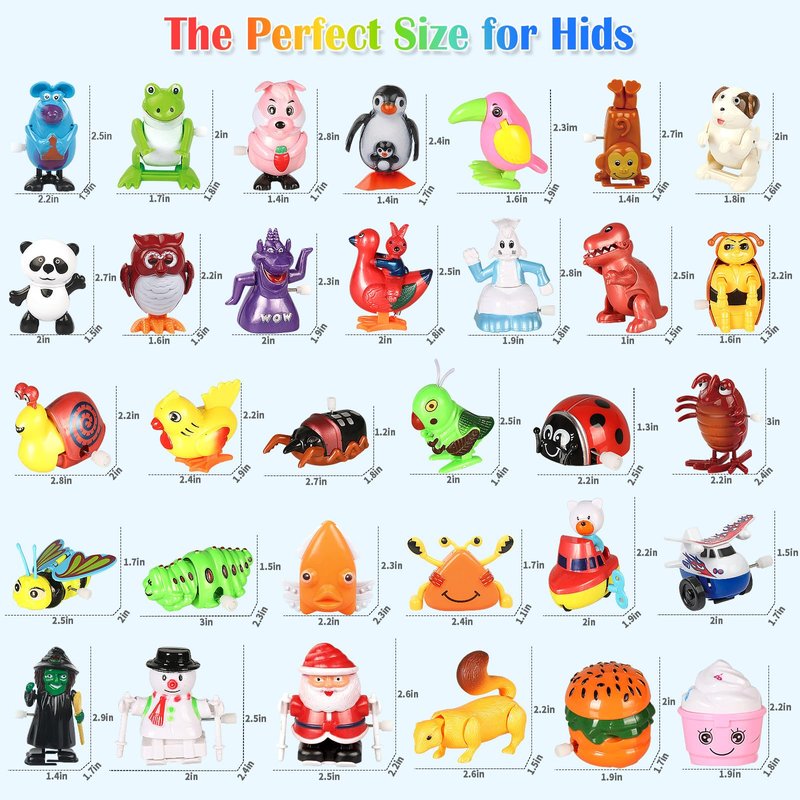 Super Value Pack: 32 Different Styles Mini Figures of Design, including a flipping frog, a penguin with baby, a hamburger, a owl, a cockroach, a handstand monkey, a skiing Santa Claus, a witch, a walking panda, a cute puppy, a mouthwatering ice cream, a ship, a charming butterfly,and many more wind up toys to be explored.