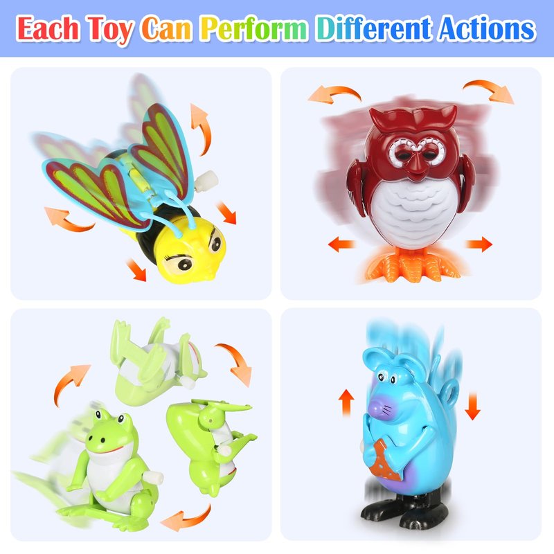- Super Fun: Simply prime the clockwork mechanism, then each wind-up toy does a different trick such as Swimming in water, Flipping, Sliding, Spinning, Walking, Shaking head or tail and else.