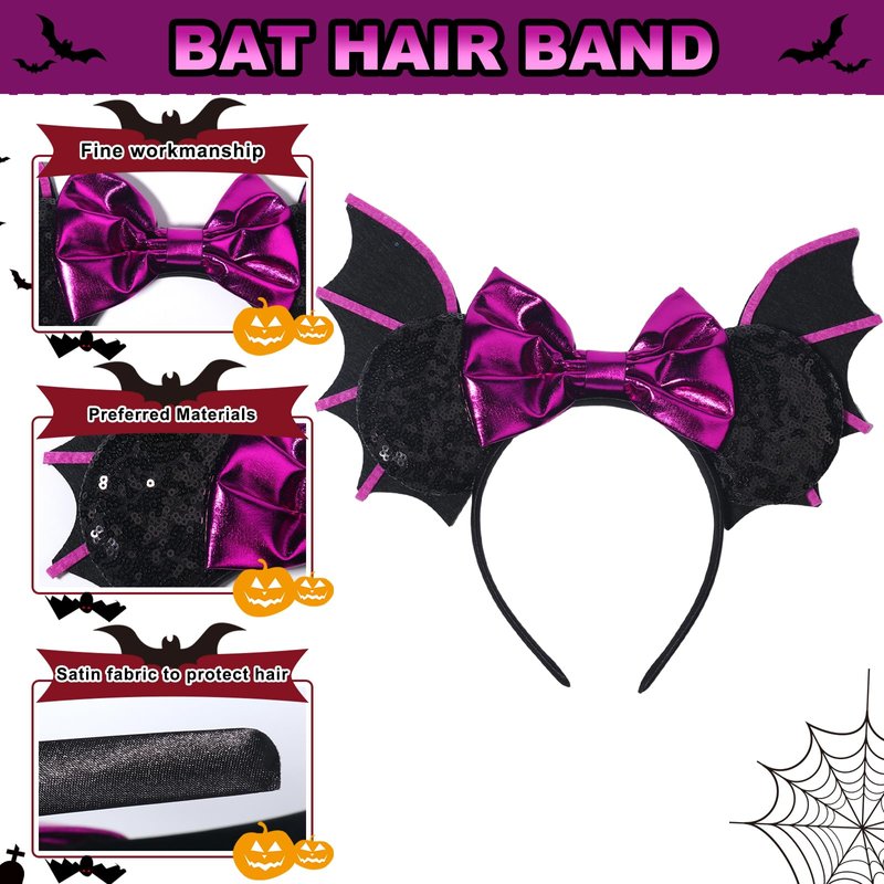 CIVFCRT Halloween Mouse Ears Headbands Purple Bat Purple Shiny Bows Mouse Ears Headbands Halloween Hair Decoration and Mouse Themed Party Supplies Costume Cosplay Decoration for Women(Bat)
